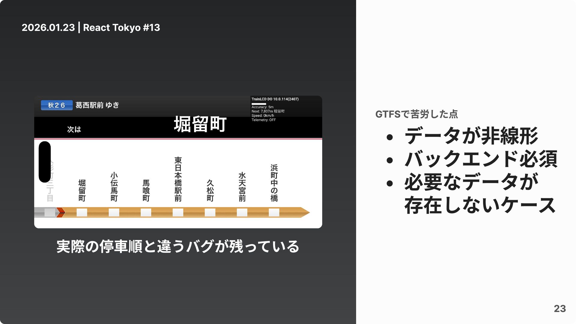 実際の停車順と違うバグが残っている 2026.01.23 | React Tokyo #13 23 データが非線形 バックエンド必須 必要なデータが