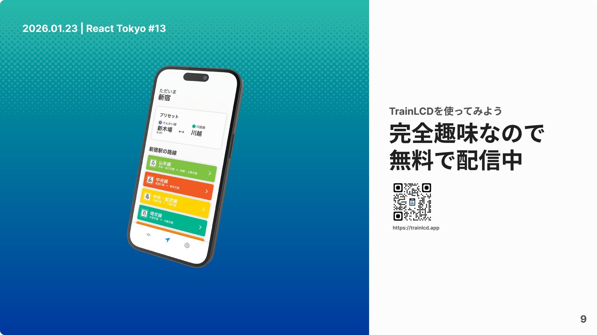 9 2026.01.23 | React Tokyo #13 完全趣味なので 無料で配信中 TrainLCDを使ってみよう https://trainlcd.app