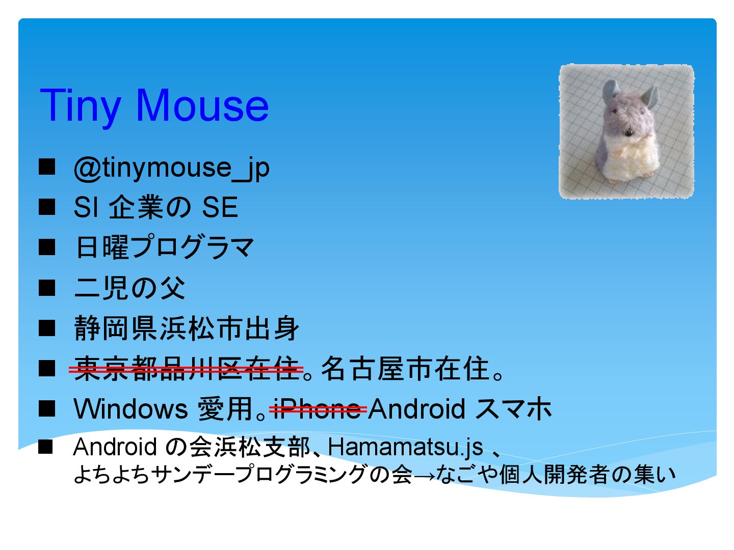 ◼ 静岡県浜松市出身 ◼ 東京都品川区在住。名古屋市在住。 ◼ Windows 愛用。iPhone Android スマホ ◼ Android の会浜松支部、Hamamatsu.js 、 よちよちサンデープログラミングの会→なごや個人開発者の集い Tiny Mouse