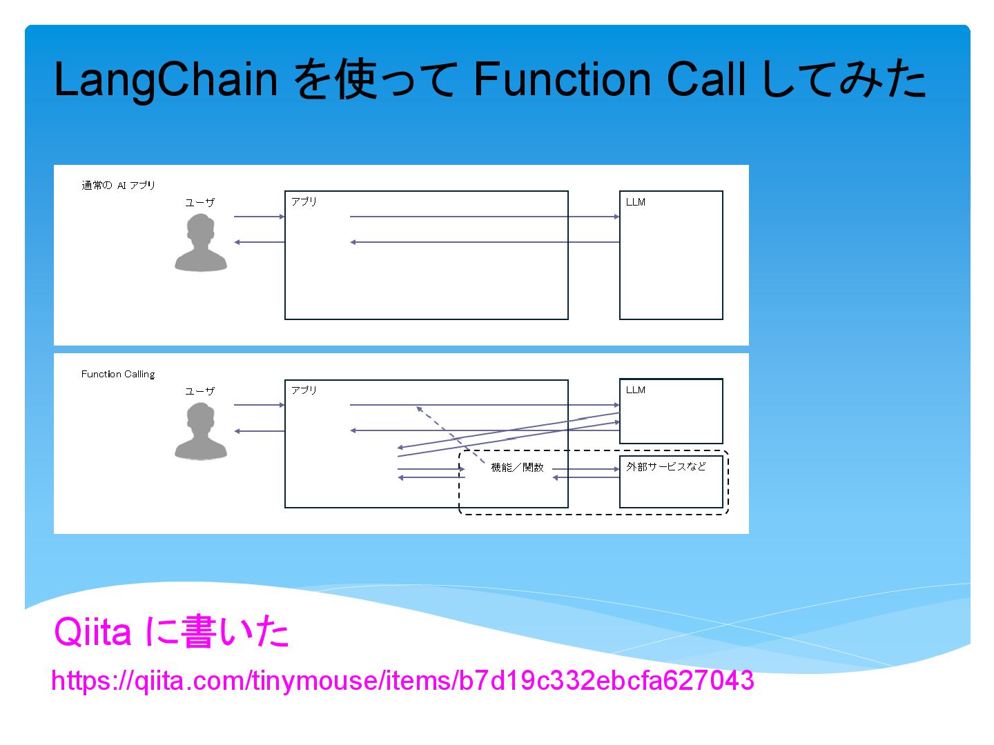 LangChain を使って Function Call してみた https://qiita.com/tinymouse/items/b7d19c332ebcfa627043 Qiita に書いた