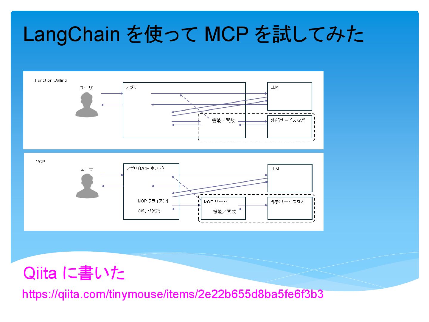 LangChain を使って MCP を試してみた https://qiita.com/tinymouse/items/2e22b655d8ba5fe6f3b3 Qiita に書いた