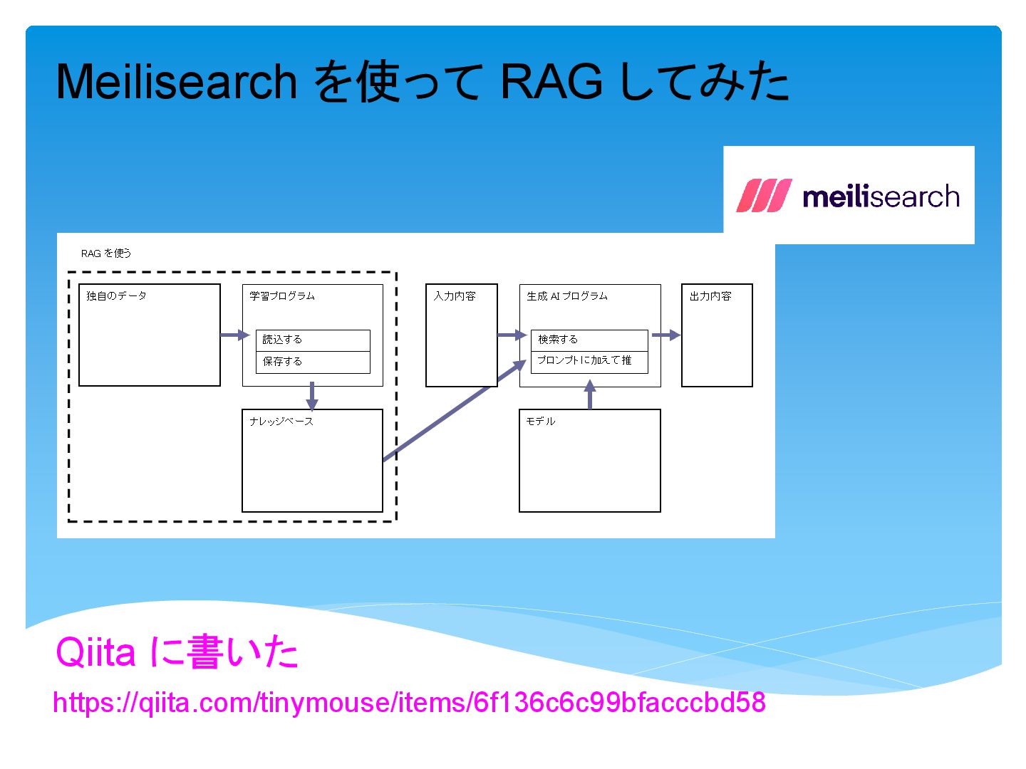 Meilisearch を使って RAG してみた https://qiita.com/tinymouse/items/6f136c6c99bfacccbd58 Qiita に書いた
