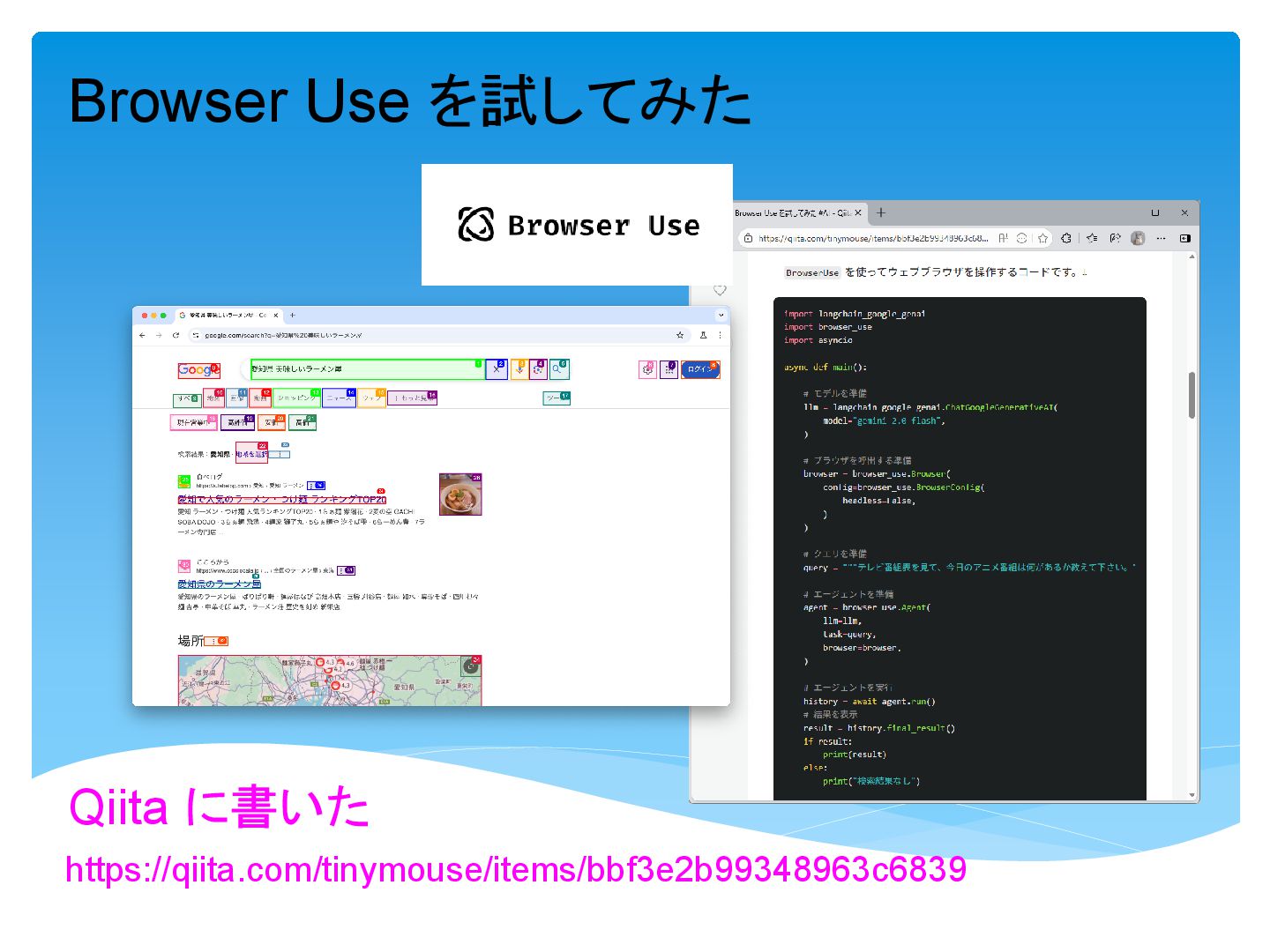 Browser Use を試してみた https://qiita.com/tinymouse/items/bbf3e2b99348963c6839 Qiita に書いた