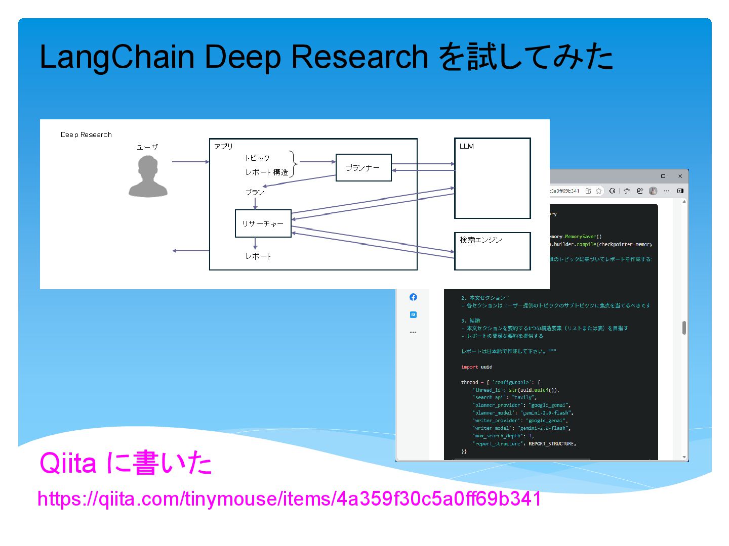 LangChain Deep Research を試してみた Qiita に書いた https://qiita.com/tinymouse/items/4a359f30c5a0ff69b341