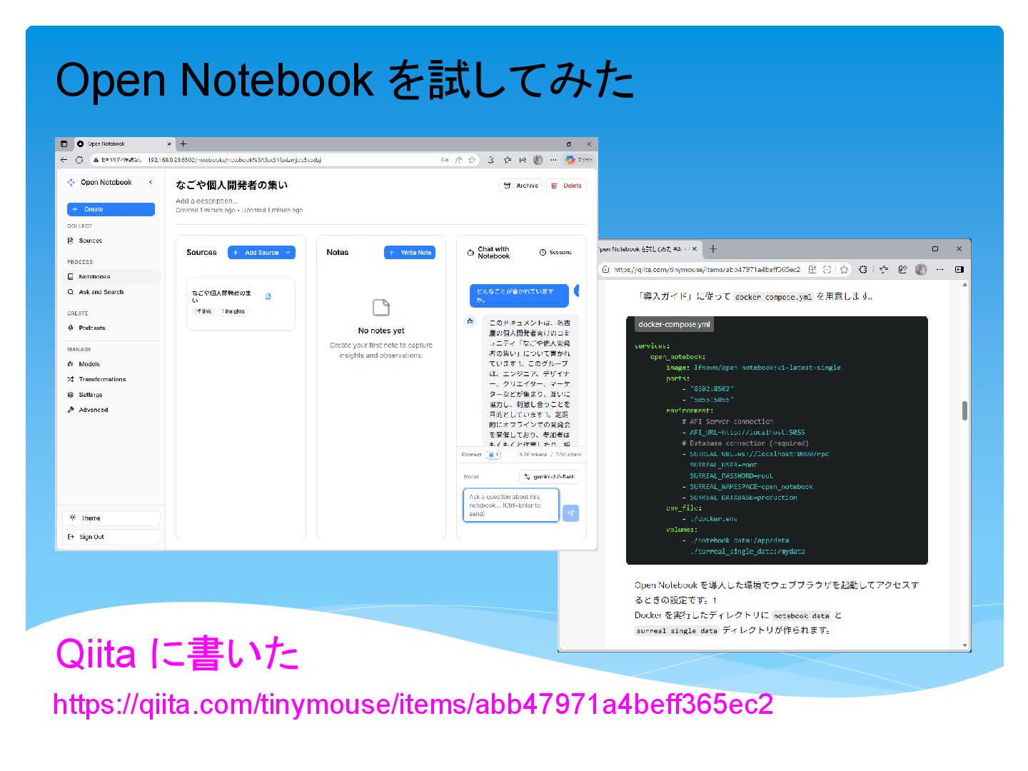 Open Notebook を試してみた Qiita に書いた https://qiita.com/tinymouse/items/abb47971a4beff365ec2