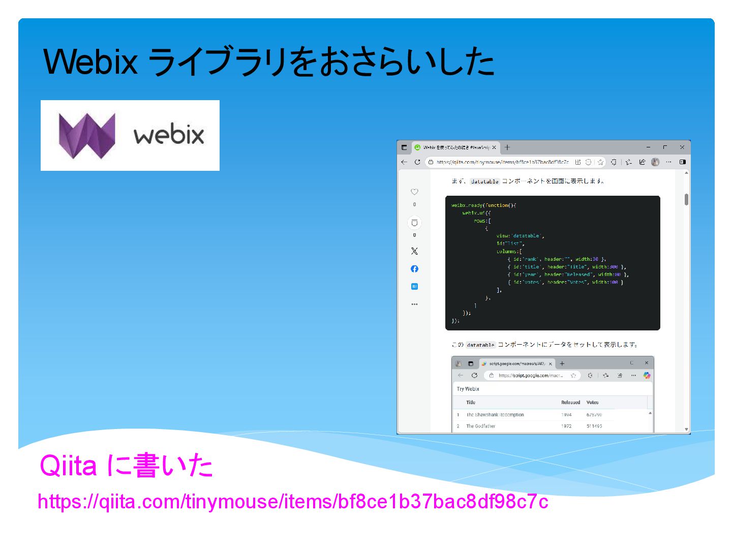 Webix ライブラリをおさらいした https://qiita.com/tinymouse/items/bf8ce1b37bac8df98c7c Qiita に書いた