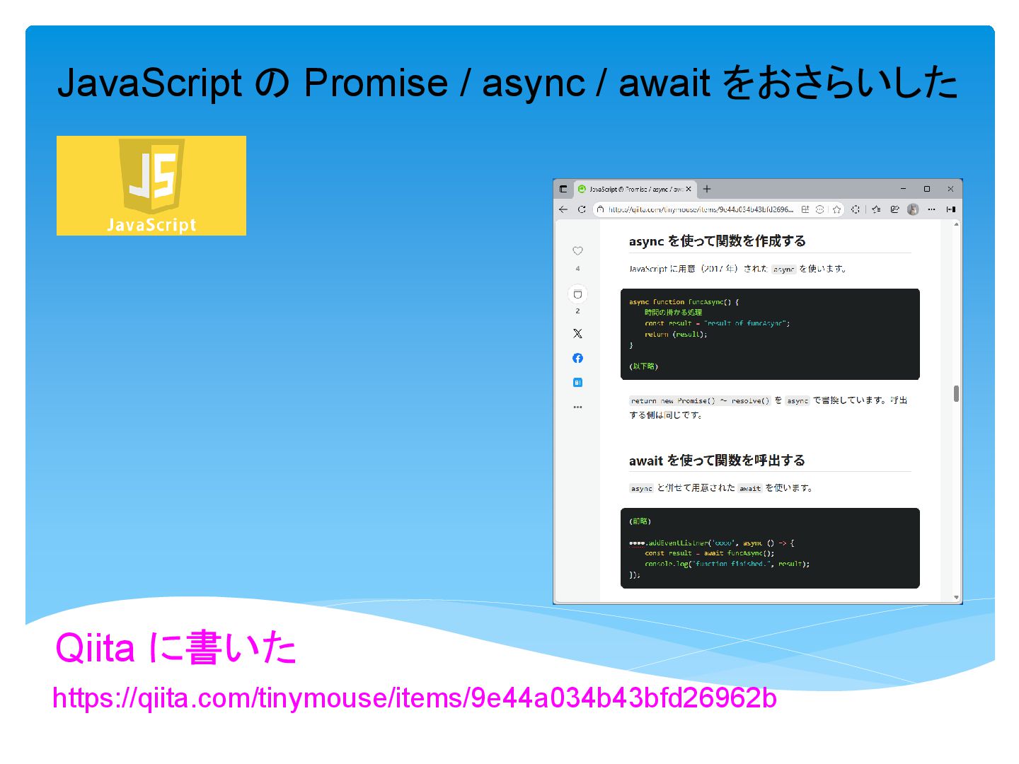 JavaScript の Promise / async / await をおさらいした https://qiita.com/tinymouse/items/9e44a034b43bfd26962b Qiita
