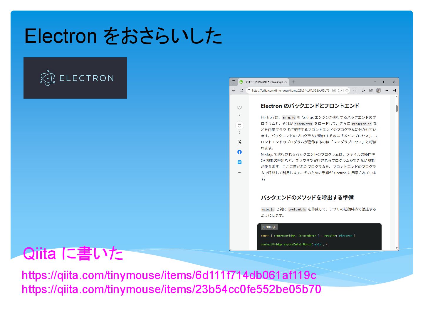 Electron をおさらいした Qiita に書いた https://qiita.com/tinymouse/items/6d111f714db061af119c https://qiita.com/tinymouse/items/23b54cc0fe552be05b70
