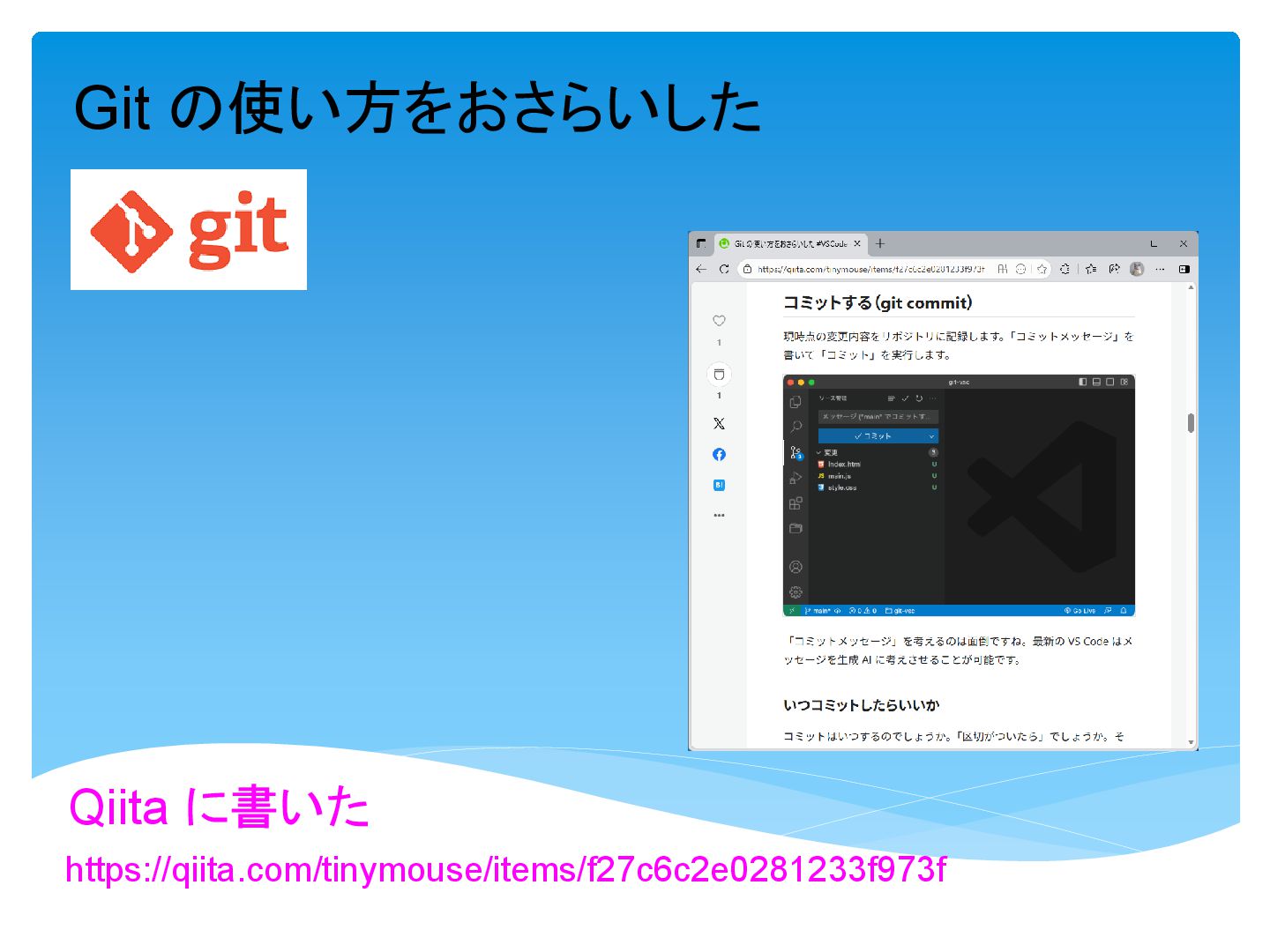 Git の使い方をおさらいした https://qiita.com/tinymouse/items/f27c6c2e0281233f973f Qiita に書いた