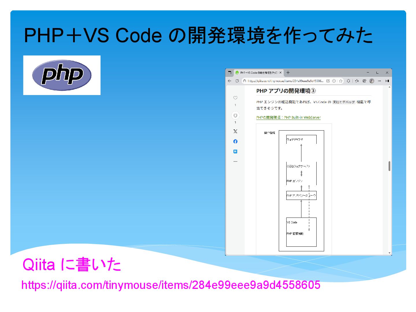 PHP+VS Code の開発環境を作ってみた https://qiita.com/tinymouse/items/284e99eee9a9d4558605 Qiita に書いた