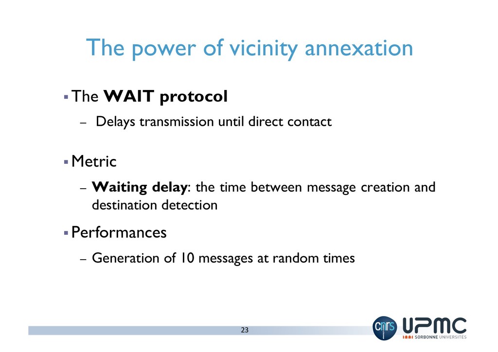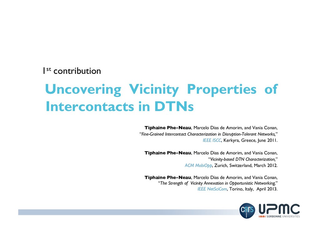 Phe-Neau, Marcelo Dias de Amorim, and Vania Conan, “Fine-Grained Intercontact Characterization in Disruption-Tolerant Networks,” IEEE ISCC, Kerkyra, Greece, June 2011. Tiphaine Phe-Neau, Marcelo Dias de Amorim, and Vania Conan, “Vicinity-based DTN Characterization,” ACM MobiOpp, Zurich, Switzerland, March 2012. Tiphaine Phe-Neau, Marcelo Dias de Amorim, and Vania Conan, “The Strength of Vicinity Annexation in Opportunistic Networking,” IEEE NetSciCom, Torino, Italy, April 2013.