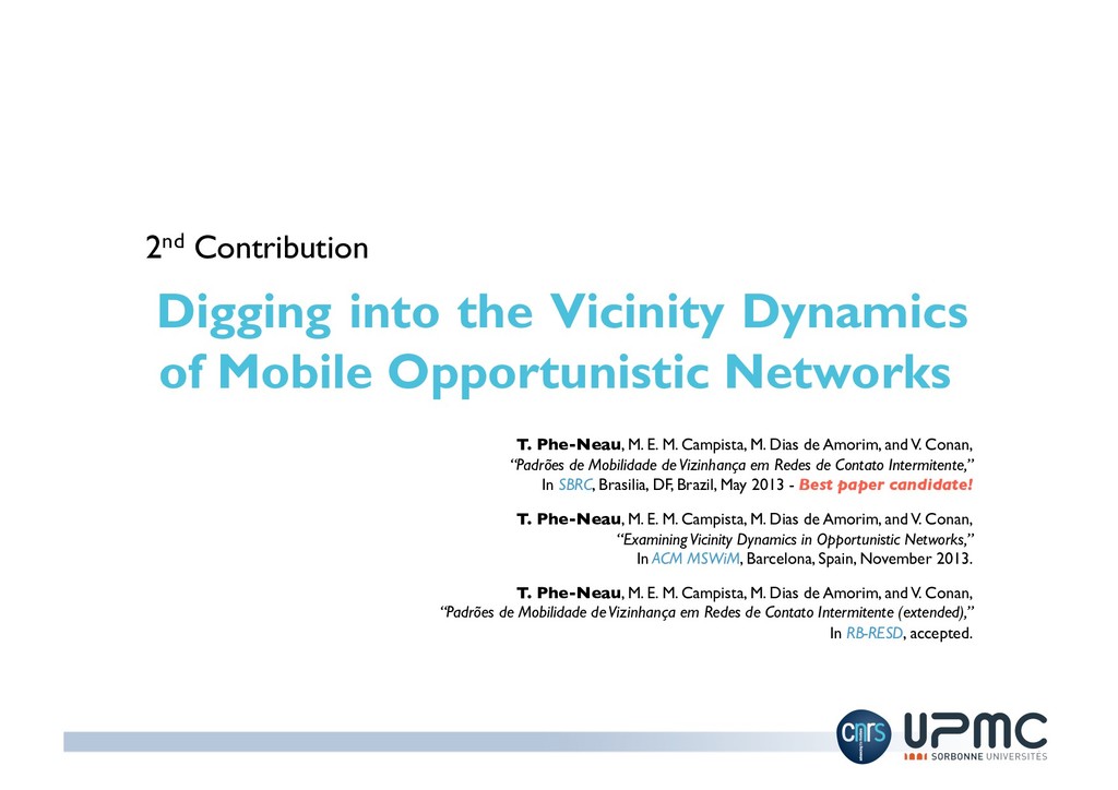 Contribution T. Phe-Neau, M. E. M. Campista, M. Dias de Amorim, and V. Conan, “Padrões de Mobilidade de Vizinhança em Redes de Contato Intermitente,” In SBRC, Brasilia, DF, Brazil, May 2013 - Best paper candidate! T. Phe-Neau, M. E. M. Campista, M. Dias de Amorim, and V. Conan, “Examining Vicinity Dynamics in Opportunistic Networks,” In ACM MSWiM, Barcelona, Spain, November 2013. T. Phe-Neau, M. E. M. Campista, M. Dias de Amorim, and V. Conan, “Padrões de Mobilidade de Vizinhança em Redes de Contato Intermitente (extended),” In RB-RESD, accepted.
