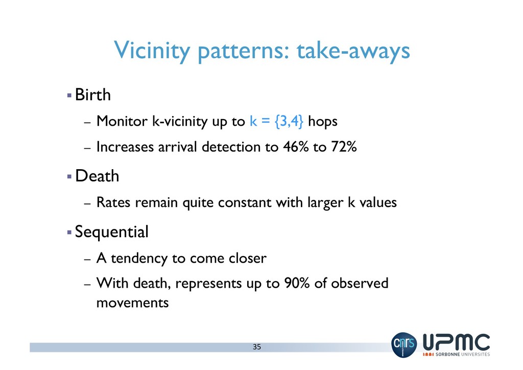 = {3,4} hops – Increases arrival detection to 46% to 72% Death – Rates remain quite constant with larger k values Sequential – A tendency to come closer – With death, represents up to 90% of observed movements 35