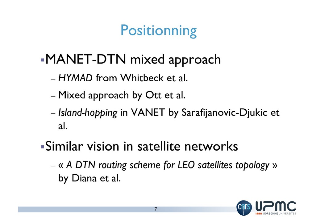 – Mixed approach by Ott et al. – Island-hopping in VANET by Sarafijanovic-Djukic et al. Similar vision in satellite networks – « A DTN routing scheme for LEO satellites topology » by Diana et al. 7