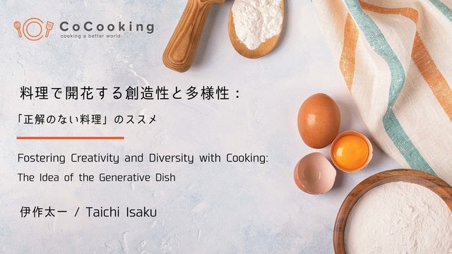 スマートキッチンの流れの中で、スローで、クリエイティブで自己目的的な料理をどう支援していくか。毎回違う結果が出来上がり、臨機応変なプロセスをとおじて生成的に名前がつく「正解のない料理」についての発表です。