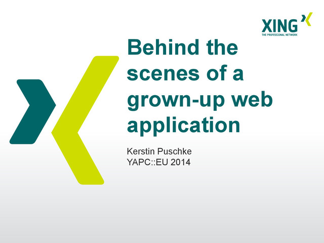 https://www.xing.com/profile/ Kerstin_Puschke software engineer at XING Hamburg • xing.com social network for business professionals • about 14M users • debian, perl, javascript, ruby on rails, mysql, redis, riak, . . . We’re hiring! http://corporate.xing.com/ english/company/careers-at-xing/ August 14 // Behind the scenes of a grown-up web application // Kerstin Puschke // YAPC::EU 2014 2