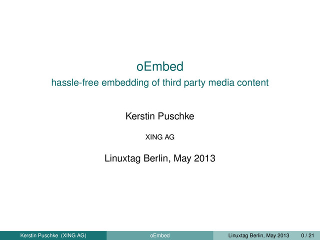 XING Hamburg working on xing.com, the social network for business professionals about 13 million users debian, perl, javascript, ruby on rails, mysql, redis, riak, . . . We’re hiring! http://corporate.xing.com/english/company/ careers-at-xing/ Kerstin Puschke (XING AG) oEmbed Linuxtag Berlin, May 2013 1 / 21