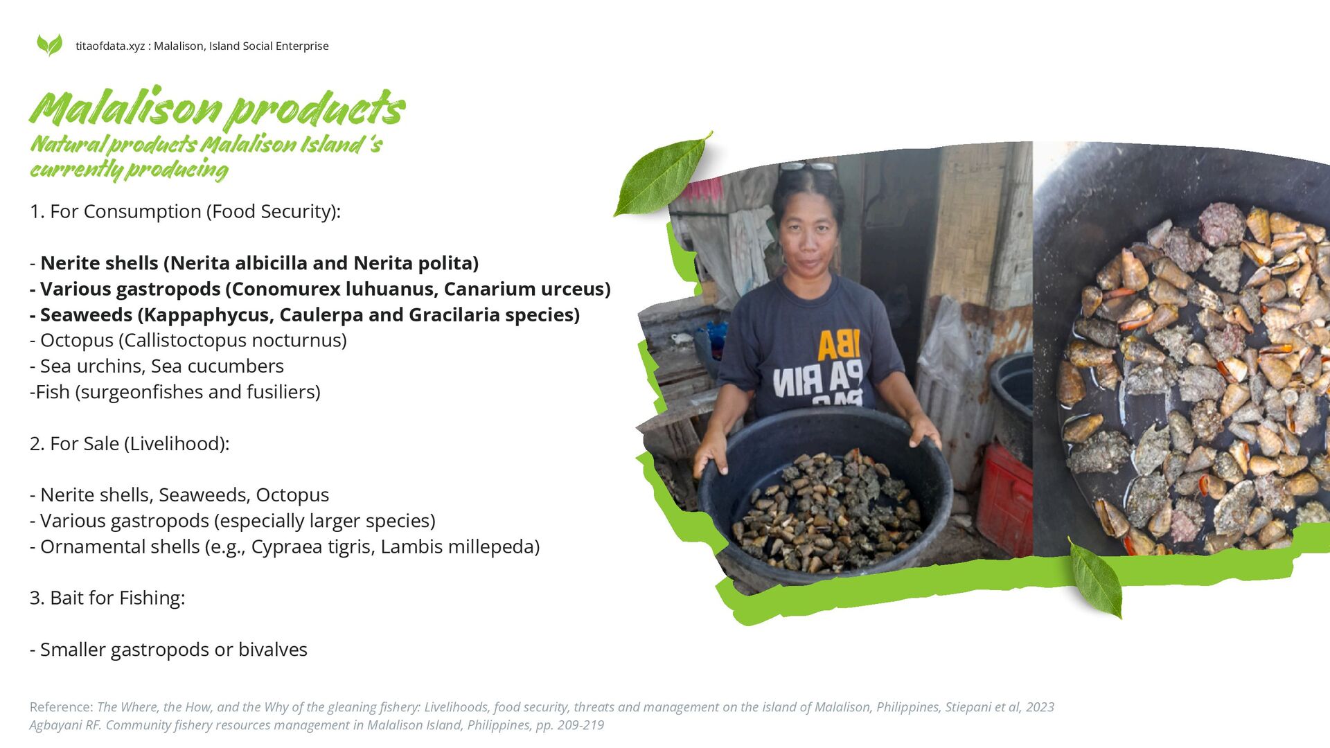 (Nerita albicilla and Nerita polita) - Various gastropods (Conomurex luhuanus, Canarium urceus) - Seaweeds (Kappaphycus, Caulerpa and Gracilaria species) - Octopus (Callistoctopus nocturnus) - Sea urchins, Sea cucumbers -Fish (surgeonfishes and fusiliers) 2. For Sale (Livelihood): - Nerite shells, Seaweeds, Octopus - Various gastropods (especially larger species) - Ornamental shells (e.g., Cypraea tigris, Lambis millepeda) 3. Bait for Fishing: - Smaller gastropods or bivalves Natural products Malalison Island ‘s currently producing Reference: The Where, the How, and the Why of the gleaning fishery: Livelihoods, food security, threats and management on the island of Malalison, Philippines, Stiepani et al, 2023 Agbayani RF. Community fishery resources management in Malalison Island, Philippines, pp. 209-219 titaofdata.xyz : Malalison, Island Social Enterprise