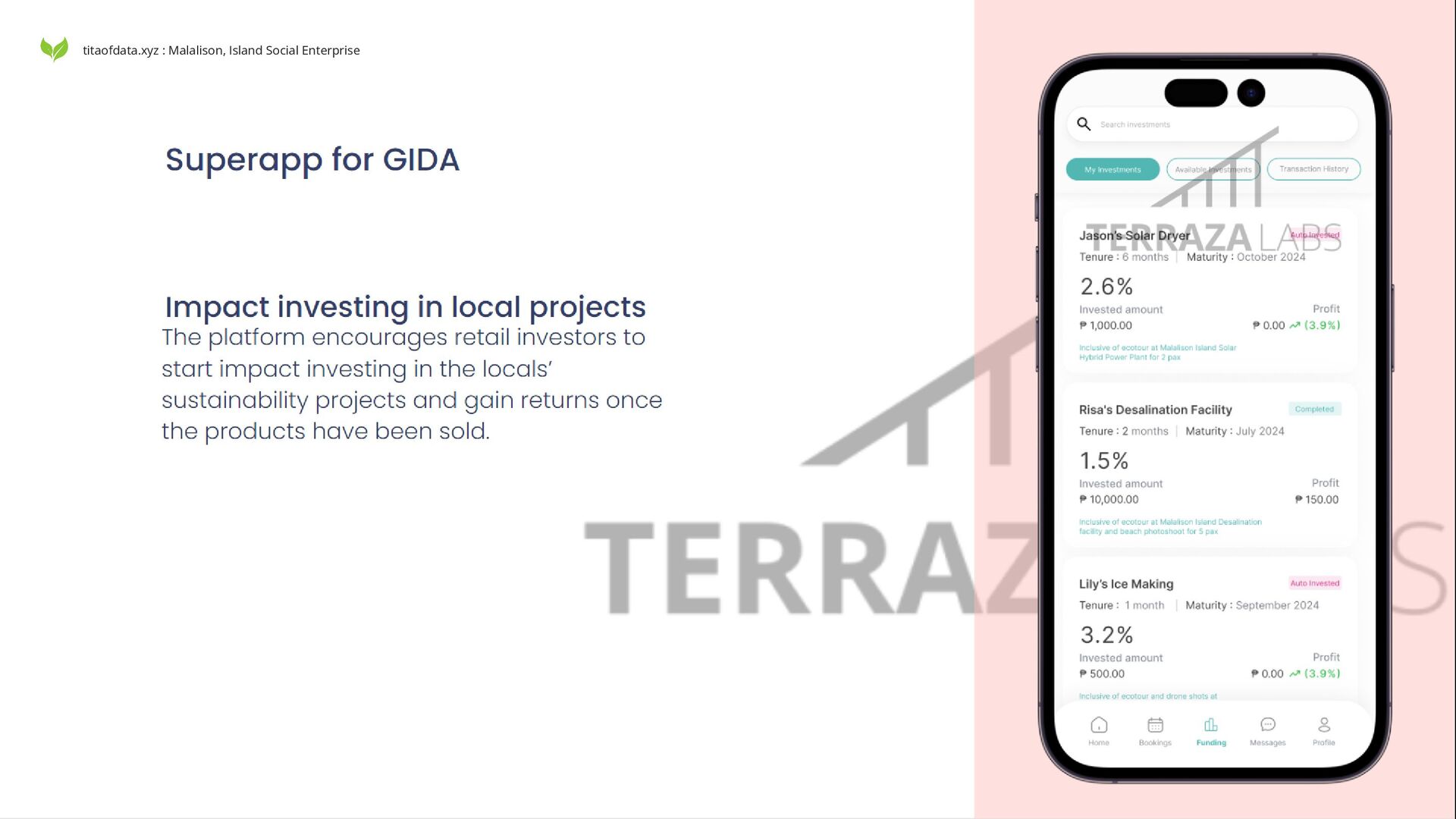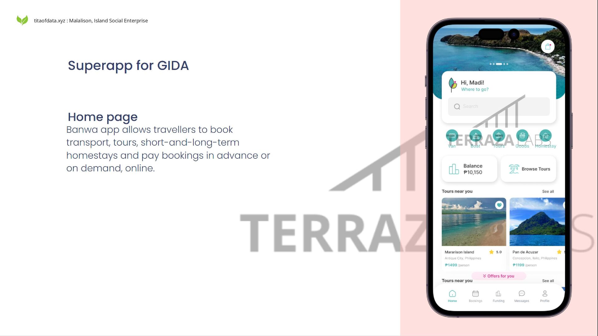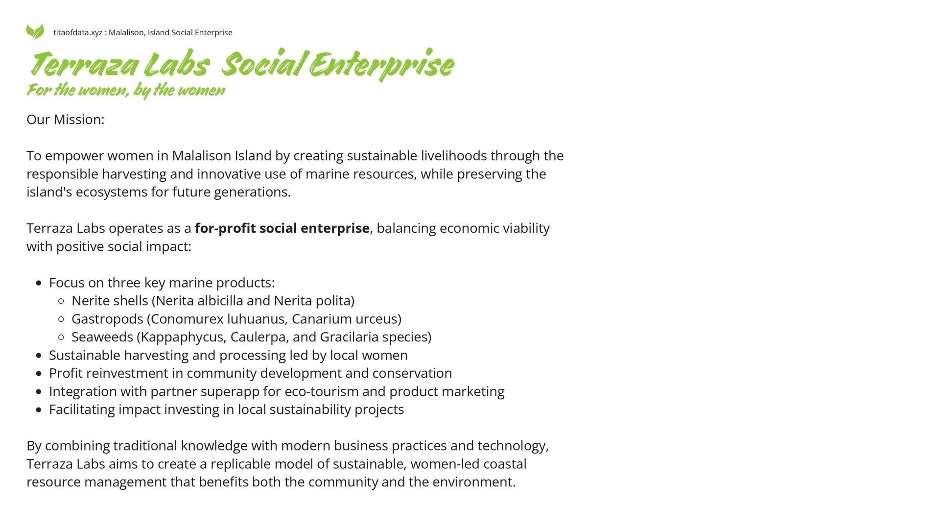 Malalison Island by creating sustainable livelihoods through the responsible harvesting and innovative use of marine resources, while preserving the island's ecosystems for future generations. Terraza Labs operates as a for-profit social enterprise, balancing economic viability with positive social impact: Focus on three key marine products: Nerite shells (Nerita albicilla and Nerita polita) Gastropods (Conomurex luhuanus, Canarium urceus) Seaweeds (Kappaphycus, Caulerpa, and Gracilaria species) Sustainable harvesting and processing led by local women Profit reinvestment in community development and conservation Integration with partner superapp for eco-tourism and product marketing Facilitating impact investing in local sustainability projects By combining traditional knowledge with modern business practices and technology, Terraza Labs aims to create a replicable model of sustainable, women-led coastal resource management that benefits both the community and the environment. For the women, by the women titaofdata.xyz : Malalison, Island Social Enterprise