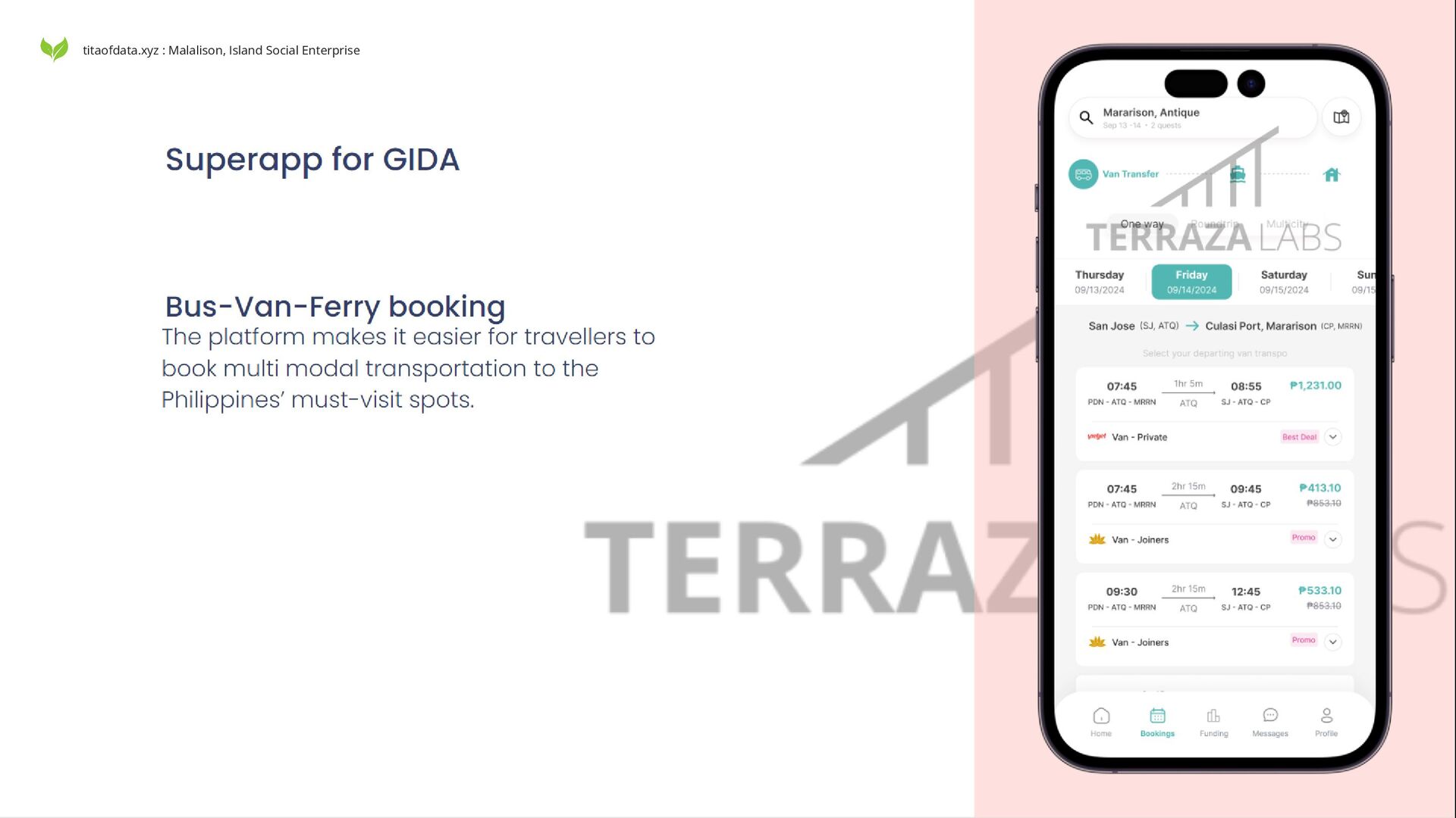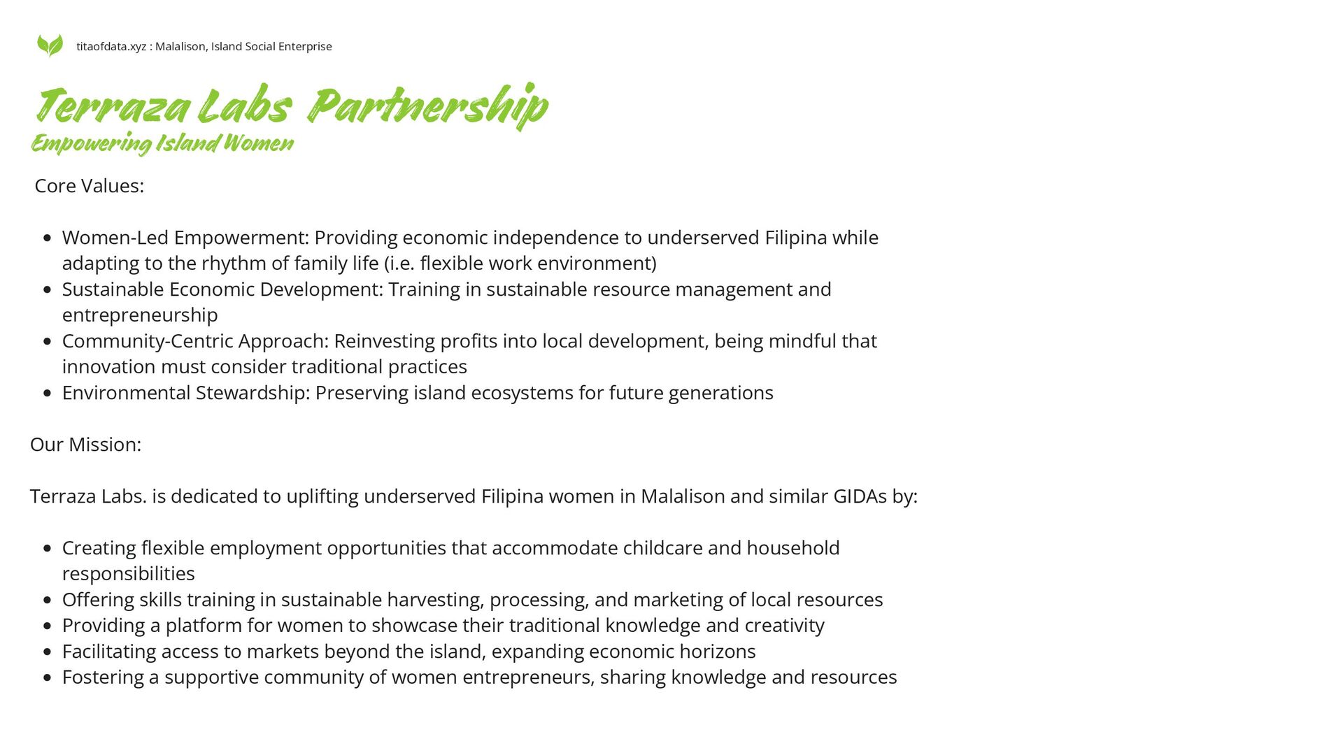 to underserved Filipina while adapting to the rhythm of family life (i.e. flexible work environment) Sustainable Economic Development: Training in sustainable resource management and entrepreneurship Community-Centric Approach: Reinvesting profits into local development, being mindful that innovation must consider traditional practices Environmental Stewardship: Preserving island ecosystems for future generations Our Mission: Terraza Labs. is dedicated to uplifting underserved Filipina women in Malalison and similar GIDAs by: Creating flexible employment opportunities that accommodate childcare and household responsibilities Offering skills training in sustainable harvesting, processing, and marketing of local resources Providing a platform for women to showcase their traditional knowledge and creativity Facilitating access to markets beyond the island, expanding economic horizons Fostering a supportive community of women entrepreneurs, sharing knowledge and resources Empowering Island Women titaofdata.xyz : Malalison, Island Social Enterprise