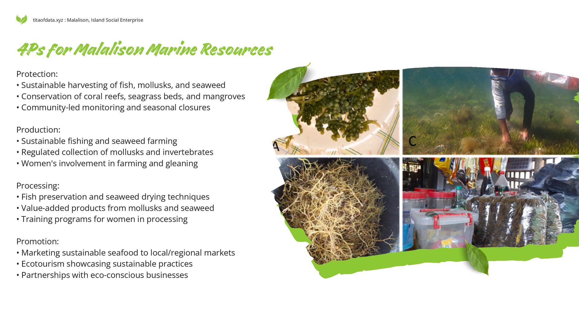 Conservation of coral reefs, seagrass beds, and mangroves • Community-led monitoring and seasonal closures Production: • Sustainable fishing and seaweed farming • Regulated collection of mollusks and invertebrates • Women's involvement in farming and gleaning Processing: • Fish preservation and seaweed drying techniques • Value-added products from mollusks and seaweed • Training programs for women in processing Promotion: • Marketing sustainable seafood to local/regional markets • Ecotourism showcasing sustainable practices • Partnerships with eco-conscious businesses 4Ps for Malalison Marine Resources titaofdata.xyz : Malalison, Island Social Enterprise