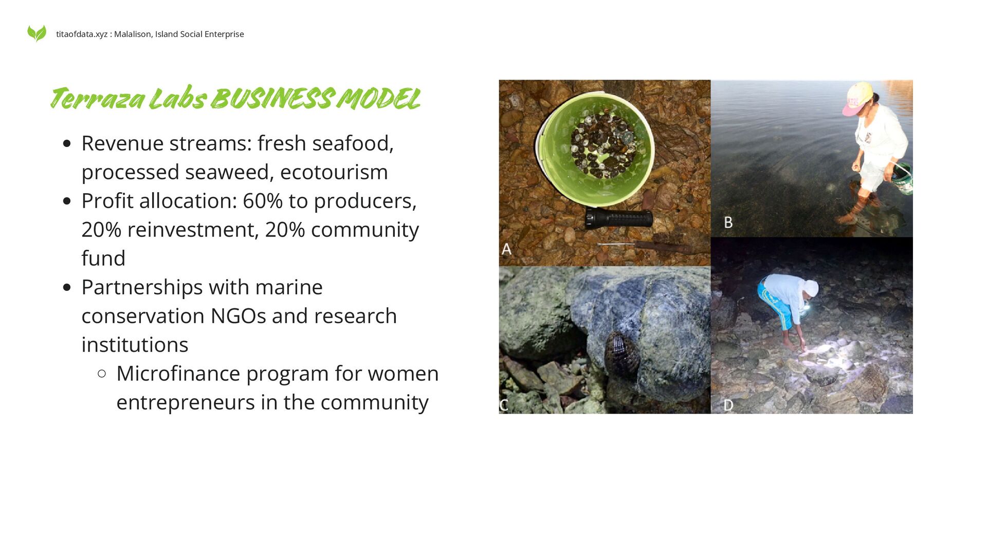 ecotourism Profit allocation: 60% to producers, 20% reinvestment, 20% community fund Partnerships with marine conservation NGOs and research institutions Microfinance program for women entrepreneurs in the community titaofdata.xyz : Malalison, Island Social Enterprise