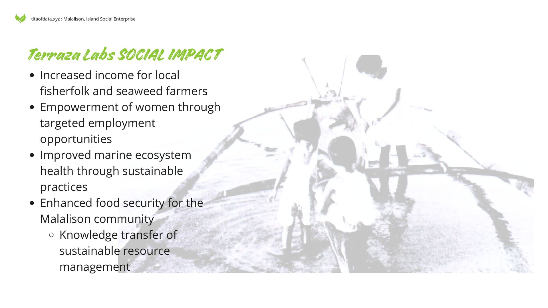 seaweed farmers Empowerment of women through targeted employment opportunities Improved marine ecosystem health through sustainable practices Enhanced food security for the Malalison community Knowledge transfer of sustainable resource management titaofdata.xyz : Malalison, Island Social Enterprise