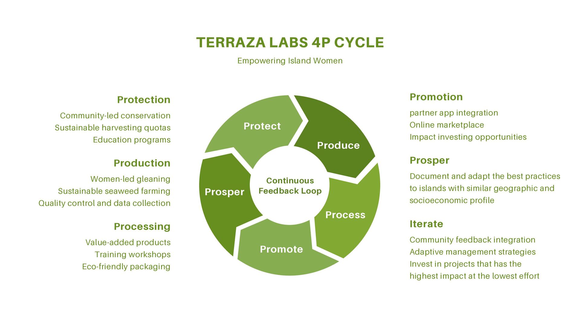 Adaptive management strategies Invest in projects that has the highest impact at the lowest effort Iterate Document and adapt the best practices to islands with similar geographic and socioeconomic profile Prosper partner app integration Online marketplace Impact investing opportunities Promotion Value-added products Training workshops Eco-friendly packaging Processing Women-led gleaning Sustainable seaweed farming Quality control and data collection Production Community-led conservation Sustainable harvesting quotas Education programs Protection Continuous Feedback Loop Protect Produce Prosper Promote Process