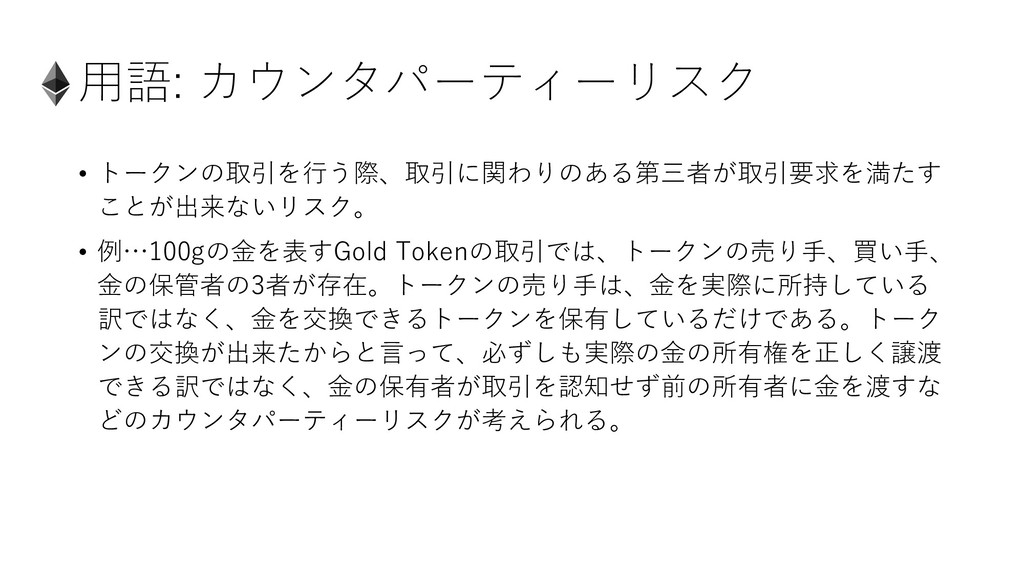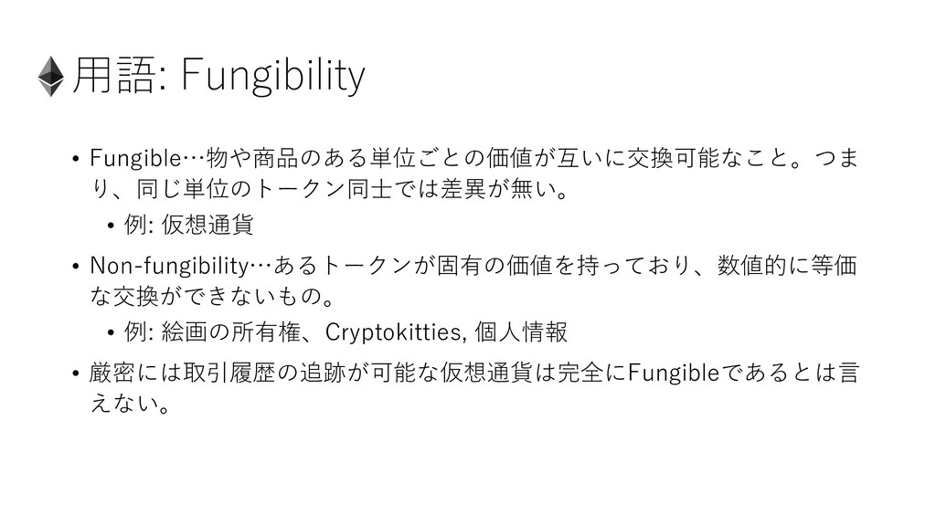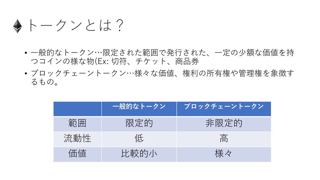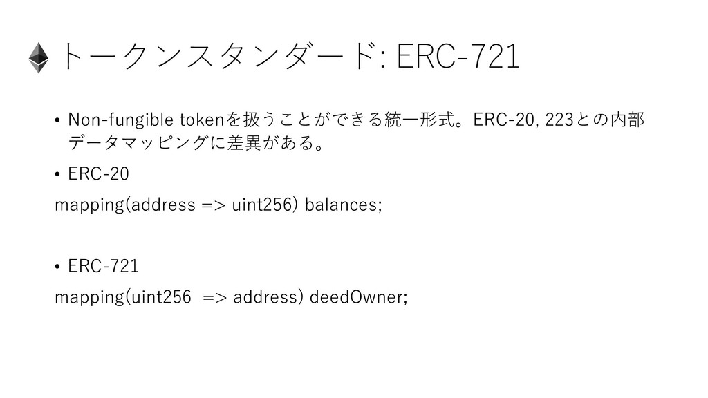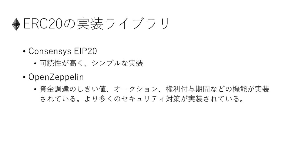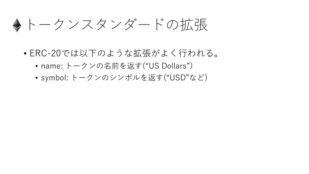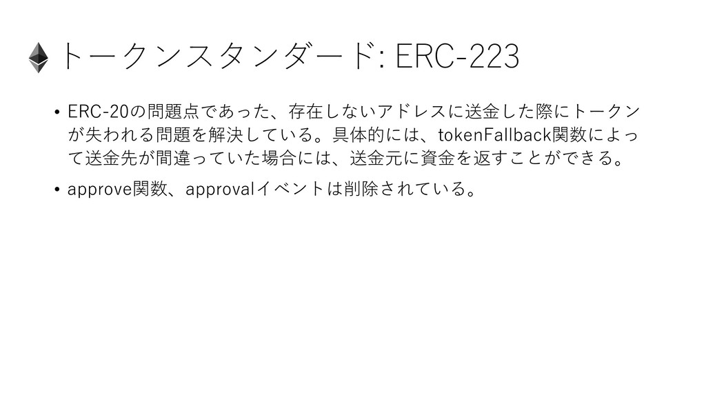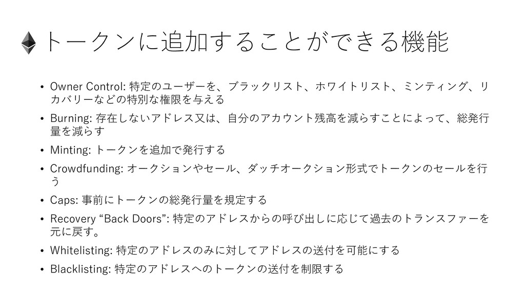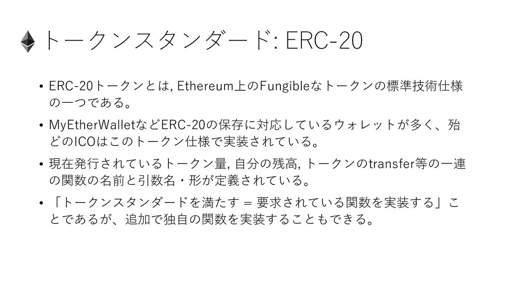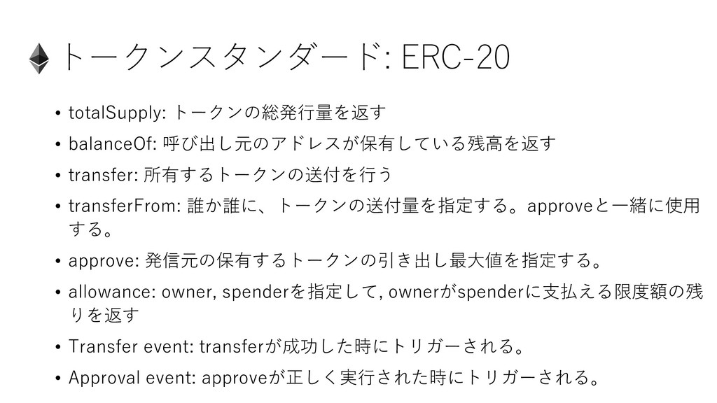 所有するトークンの送付を行う • transferFrom: 誰か誰に、トークンの送付量を指定する。approveと一緒に使用 する。 • approve: 発信元の保有するトークンの引き出し最大値を指定する。 • allowance: owner, spenderを指定して, ownerがspenderに支払える限度額の残 りを返す • Transfer event: transferが成功した時にトリガーされる。 • Approval event: approveが正しく実行された時にトリガーされる。