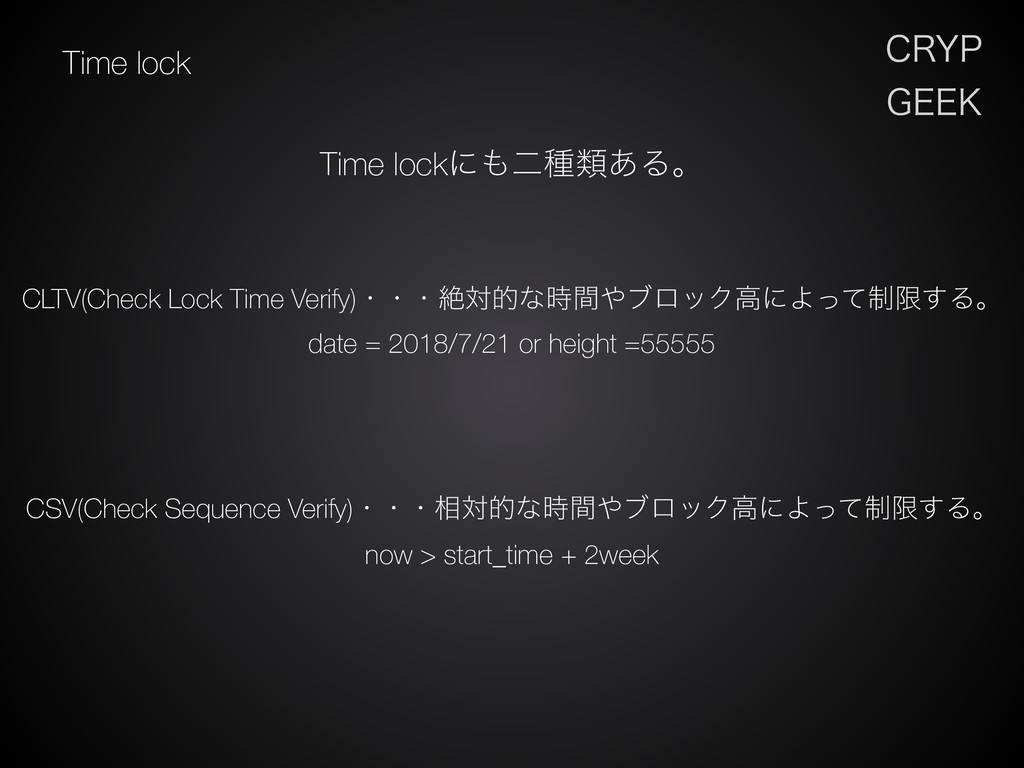 date = 2018/7/21 or height =55555 CSV(Check Sequence Verify)ɾɾɾ૬ରతͳ࣌ؒϒϩοΫߴʹΑ੍ͬͯݶ͢Δɻ now > start_time + 2week