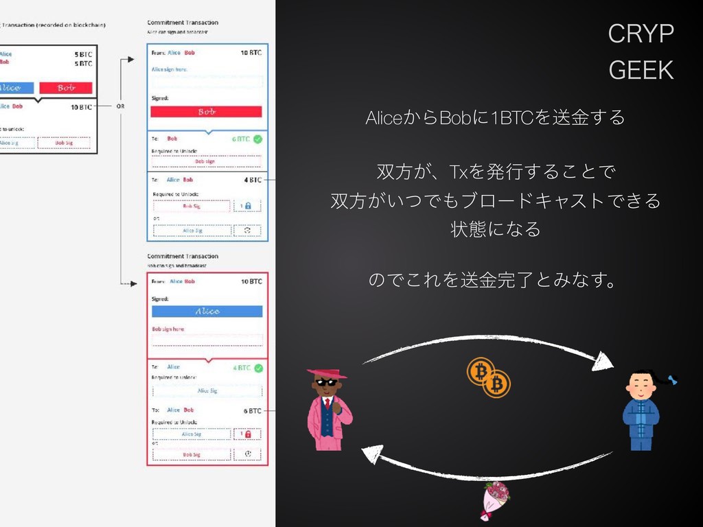 $3:1 (&&, Alice͔ΒBobʹ1BTCΛૹۚ͢Δ ํ͕ɺTxΛൃߦ͢Δ͜ͱͰ ํ͕͍ͭͰϒϩʔυΩϟετͰ͖Δ ঢ়ଶʹͳΔ ͷͰ͜ΕΛૹۚྃͱΈͳ͢ɻ