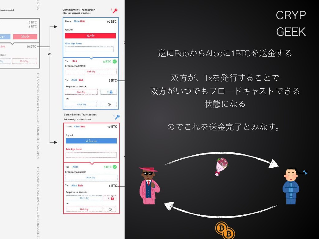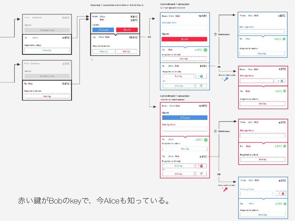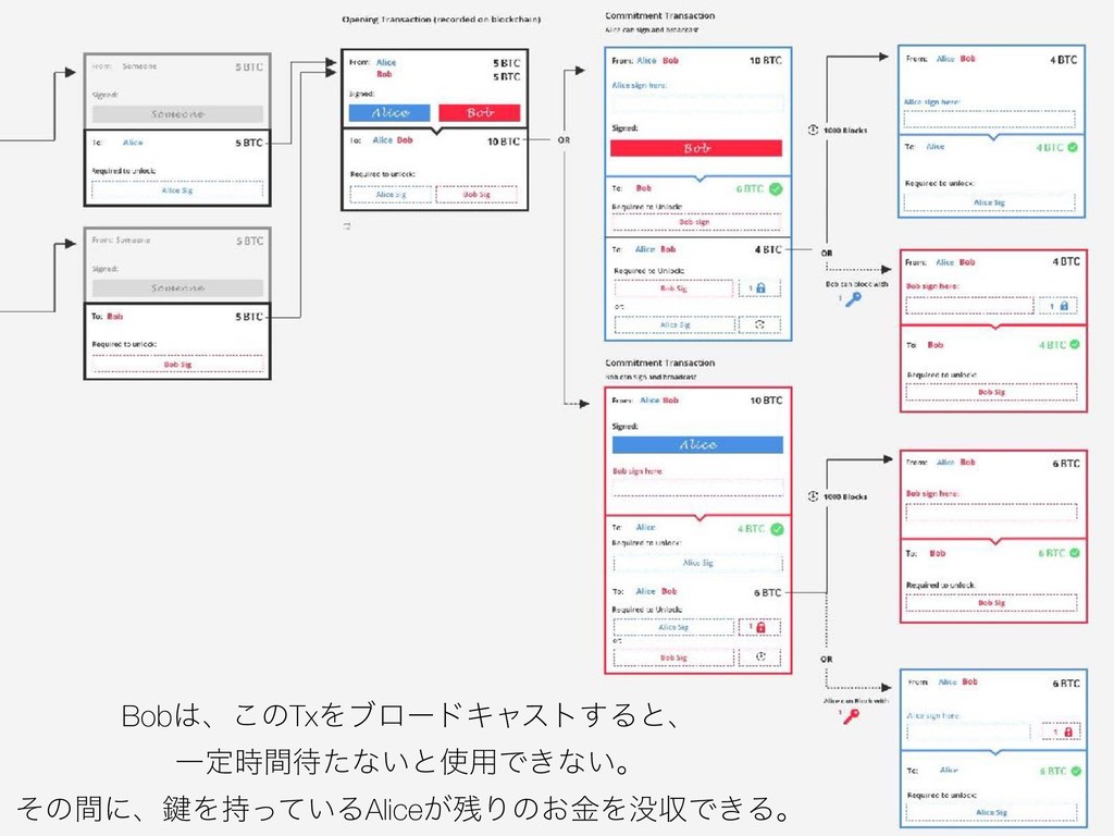 $3:1 (&&, ٯʹBob͔ΒAliceʹ1BTCΛૹۚ͢Δ ํ͕ɺTxΛൃߦ͢Δ͜ͱͰ ํ͕͍ͭͰϒϩʔυΩϟετͰ͖Δ ঢ়ଶʹͳΔ ͷͰ͜ΕΛૹۚྃͱΈͳ͢ɻ