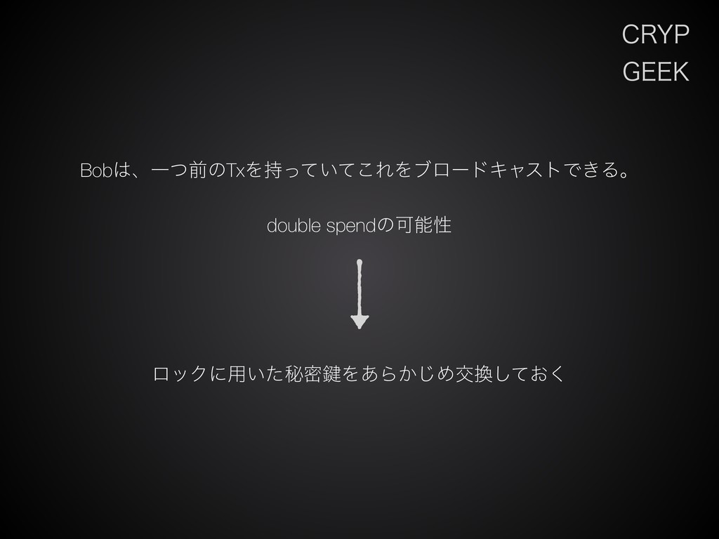 $3:1 (&&, BobɺҰͭલͷTxΛ͍࣋ͬͯͯ͜ΕΛϒϩʔυΩϟετͰ͖Δɻ double spendͷՄೳੑ ϩοΫʹ༻͍ͨൿີ伴Λ͋Β͔͡Ίަ͓ͯ͘͠