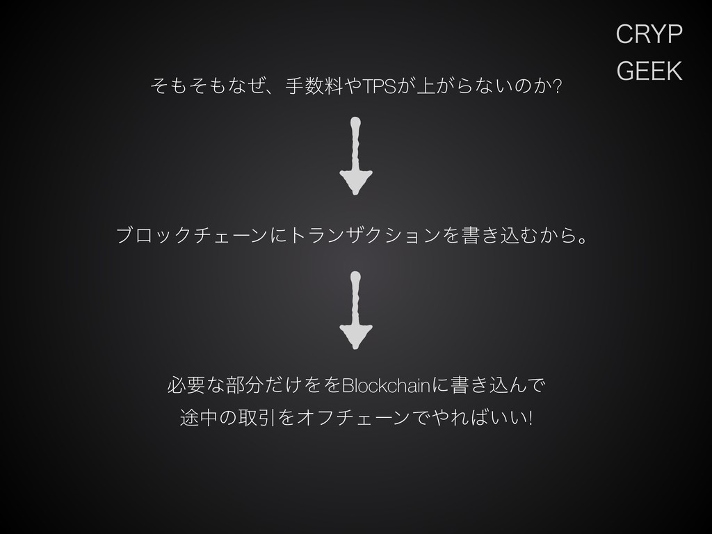 $3:1 (&&, ͦͦͳͥɺखྉTPS্͕͕Βͳ͍ͷ͔? ϒϩοΫνΣʔϯʹτϥϯβΫγϣϯΛॻ͖ࠐΉ͔Βɻ ඞཁͳ෦͚ͩΛΛBlockchainʹॻ͖ࠐΜͰ ్தͷऔҾΛΦϑνΣʔϯͰΕ͍͍!