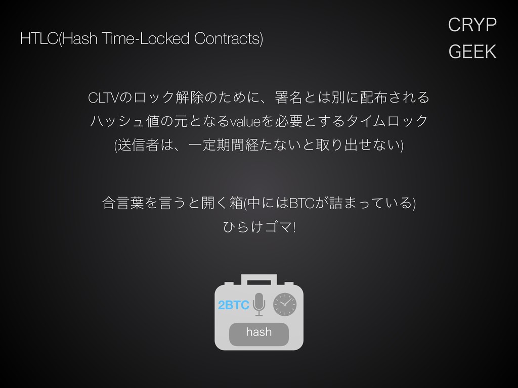 $3:1 (&&, HTLC(Hash Time-Locked Contracts) CLTVͷϩοΫղআͷͨΊʹɺॺ໊ͱผʹ͞ΕΔ ϋογϡͷݩͱͳΔvalueΛඞཁͱ͢ΔλΠϜϩοΫ (ૹ৴ऀɺҰఆظؒܦͨͳ͍ͱऔΓग़ͤͳ͍) ߹ݴ༿Λݴ͏ͱ։͘ശ(தʹBTC͕٧·͍ͬͯΔ) ͻΒ͚ΰϚ!