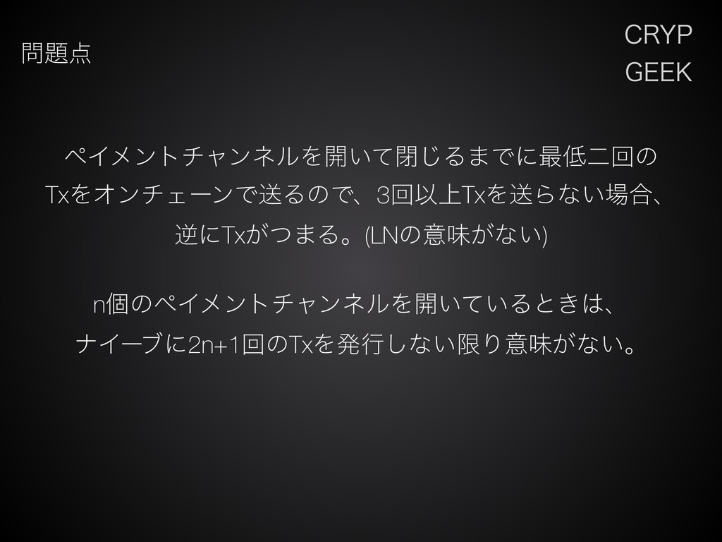 $3:1 (&&, ϖΠϝϯτνϟϯωϧΛ։͍ͯด͡Δ·Ͱʹ࠷ೋճͷ TxΛΦϯνΣʔϯͰૹΔͷͰɺ3ճҎ্TxΛૹΒͳ͍߹ɺ ٯʹTx͕ͭ·Δɻ(LNͷҙຯ͕ͳ͍) nݸͷϖΠϝϯτνϟϯωϧΛ։͍͍ͯΔͱ͖ɺ φΠʔϒʹ2n+1ճͷTxΛൃߦ͠ͳ͍ݶΓҙຯ͕ͳ͍ɻ