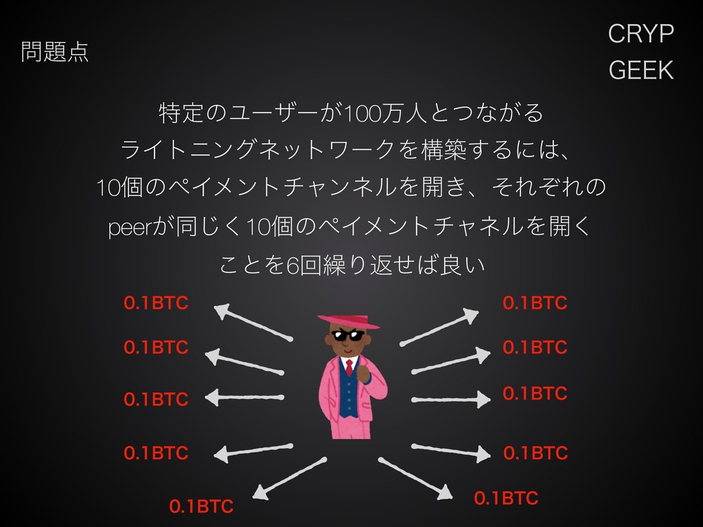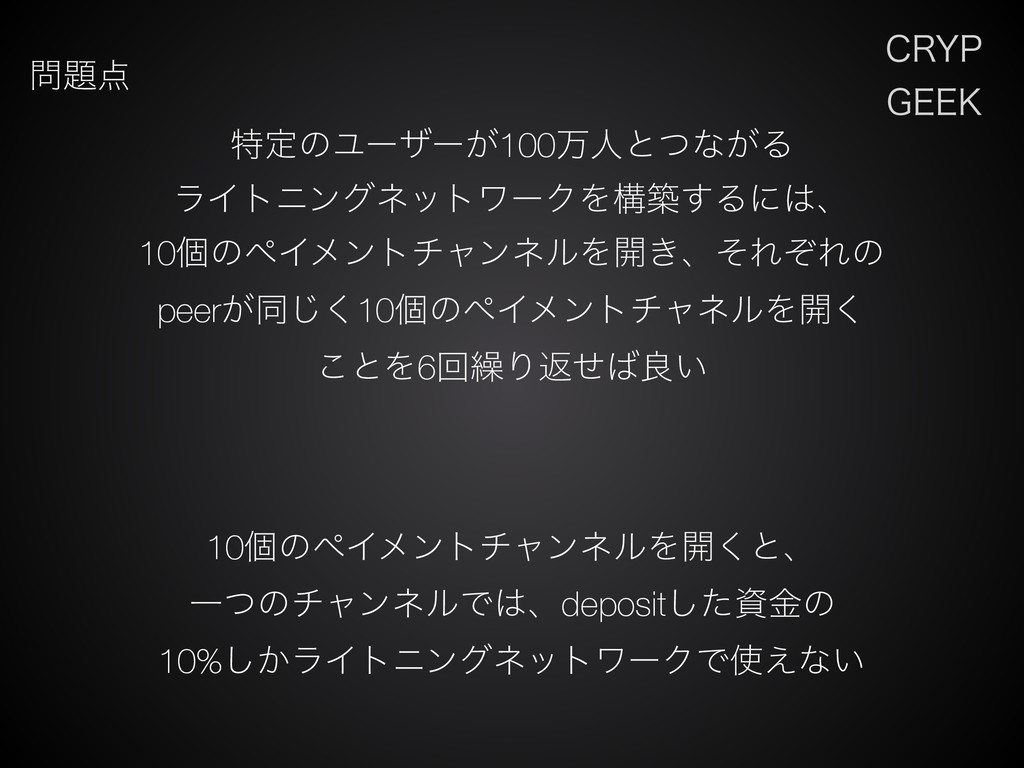 $3:1 (&&, ಛఆͷϢʔβʔ͕100ສਓͱͭͳ͕Δ ϥΠτχϯάωοτϫʔΫΛߏங͢Δʹɺ 10ݸͷϖΠϝϯτνϟϯωϧΛ։͖ɺͦΕͧΕͷ peer͕ಉ͘͡10ݸͷϖΠϝϯτνϟωϧΛ։͘ ͜ͱΛ6ճ܁Γฦͤྑ͍ 10ݸͷϖΠϝϯτνϟϯωϧΛ։͘ͱɺ ҰͭͷνϟϯωϧͰɺdepositͨ͠ࢿۚͷ