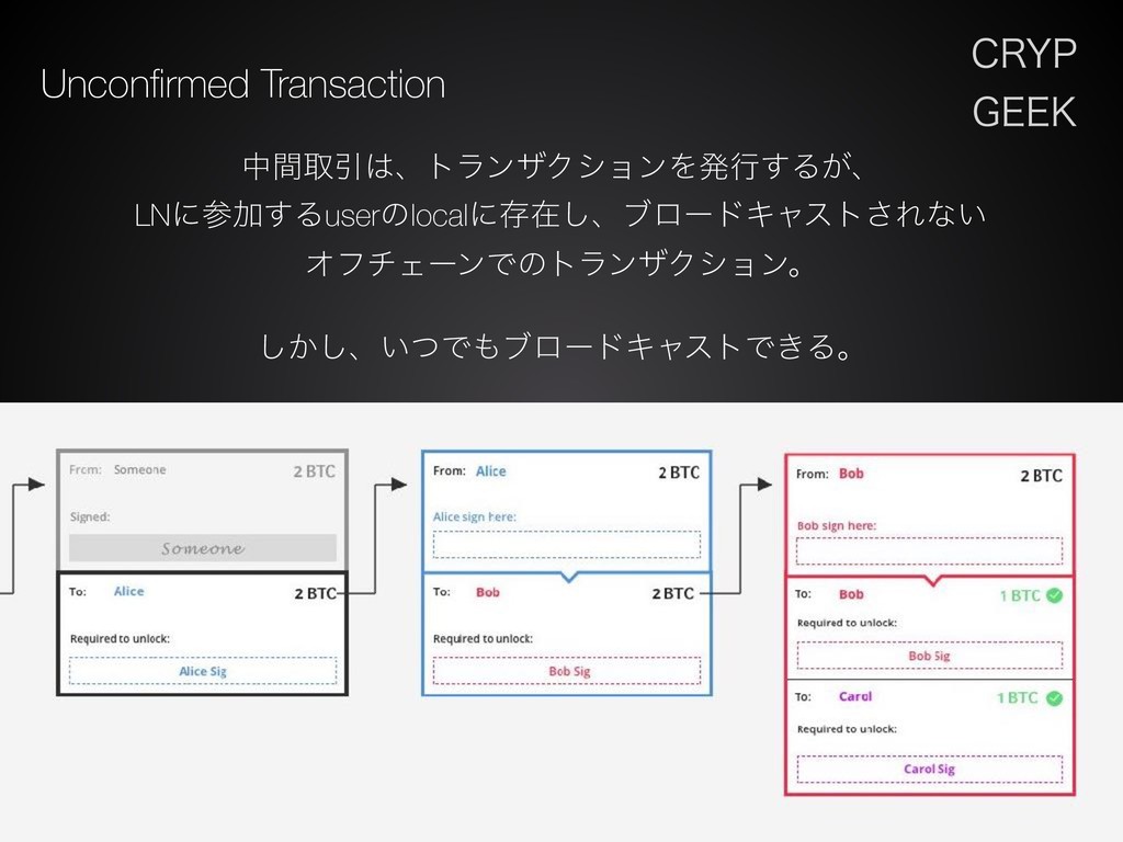 $3:1 (&&, Unconfirmed Transaction தؒऔҾɺτϥϯβΫγϣϯΛൃߦ͢Δ͕ɺ LNʹࢀՃ͢Δuserͷlocalʹଘࡏ͠ɺϒϩʔυΩϟετ͞Εͳ͍ ΦϑνΣʔϯͰͷτϥϯβΫγϣϯɻ ͔͠͠ɺ͍ͭͰϒϩʔυΩϟετͰ͖Δɻ