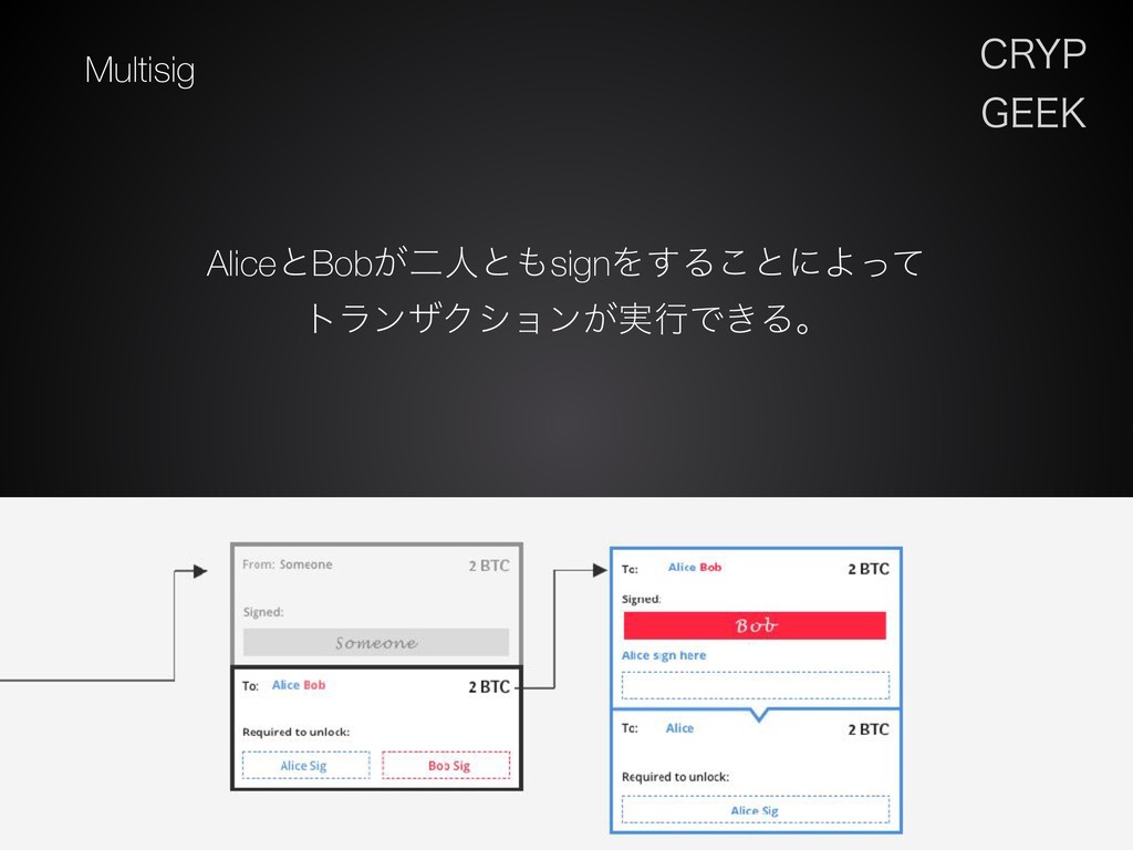 $3:1 (&&, Multisig AliceͱBob͕ೋਓͱsignΛ͢Δ͜ͱʹΑͬͯ τϥϯβΫγϣϯ͕࣮ߦͰ͖Δɻ