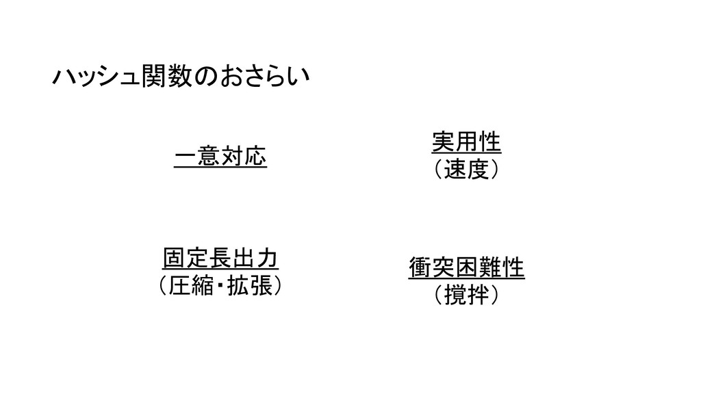ハッシュ関数のおさらい 衝突困難性 (撹拌) 実用性 (速度) 固定長出力 (圧縮・拡張) 一意対応