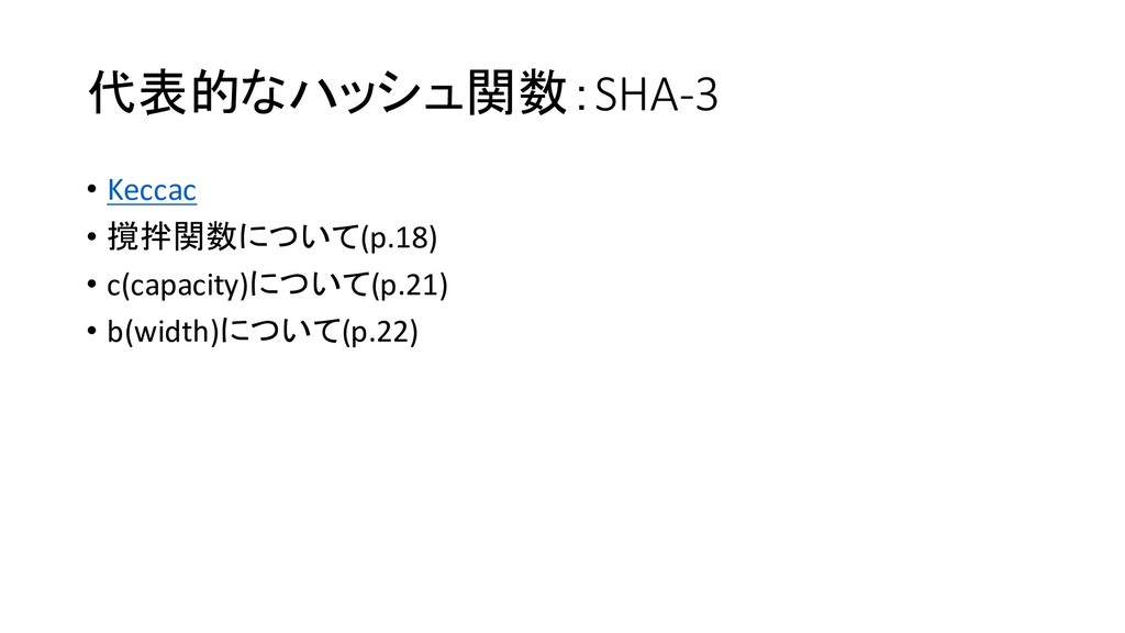代表的なハッシュ関数:SHA-3 • Keccac • 撹拌関数について(p.18) • c(capacity)について(p.21) • b(width)について(p.22)