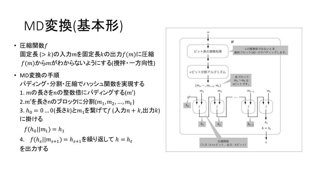 MD変換(基本形) • 圧縮関数 固定長 (> )の入力を固定長の出力()に圧縮 ()からがわからないようにする(攪拌・一方向性) • MD変換の手順 パディング・分割・圧縮でハッシュ関数を実現する