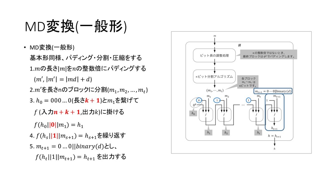 MD変換(一般形) • MD変換(一般形) 基本形同様、パディング・分割・圧縮をする 1.の長さ||をの整数倍にパディングする (′, 7 = + )