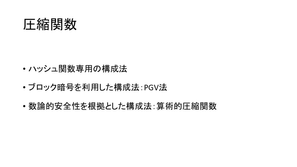 圧縮関数 • ハッシュ関数専用の構成法 • ブロック暗号を利用した構成法:PGV法 • 数論的安全性を根拠とした構成法:算術的圧縮関数