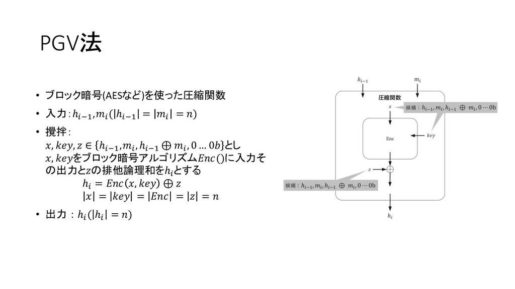PGV法 • ブロック暗号(AESなど)を使った圧縮関数 • 入力:ℎCD*,C( ℎCD* = C = )