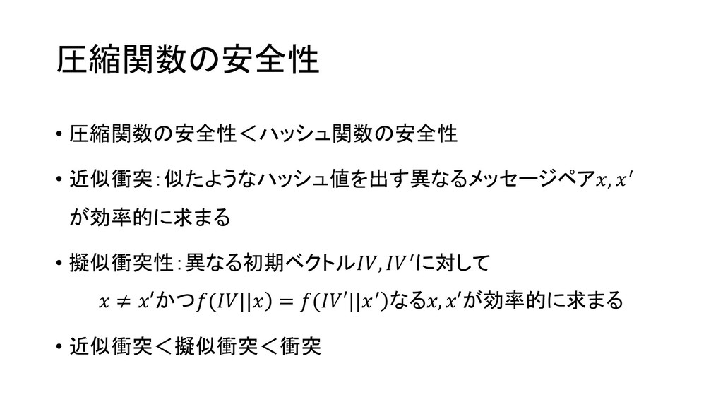 圧縮関数の安全性 • 圧縮関数の安全性<ハッシュ関数の安全性 • 近似衝突:似たようなハッシュ値を出す異なるメッセージペア, 7 が効率的に求まる • 擬似衝突性:異なる初期ベクトル, 7に対して