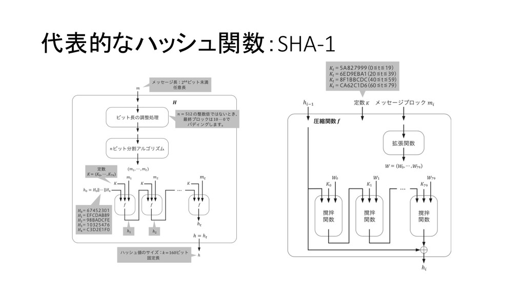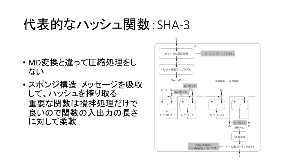 代表的なハッシュ関数:SHA-3 • MD変換と違って圧縮処理をし ない • スポンジ構造:メッセージを吸収 して、ハッシュを搾り取る 重要な関数は攪拌処理だけで 良いので関数の入出力の長さ に対して柔軟