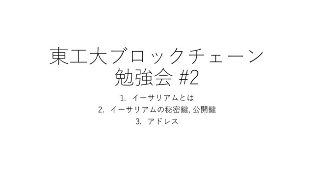 東⼯⼤ブロックチェーン 勉強会 #2 1. イーサリアムとは 2. イーサリアムの秘密鍵, 公開鍵 3. アドレス