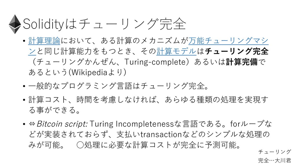 る事ができる。 • ⇔Bitcoin script: Turing Incompletenessな⾔語である。forループな どが実装されておらず、⽀払いtransactionなどのシンプルな処理の みが可能。 ◦処理に必要な計算コストが完全に予測可能。 チューリング 完全…⼤川君
