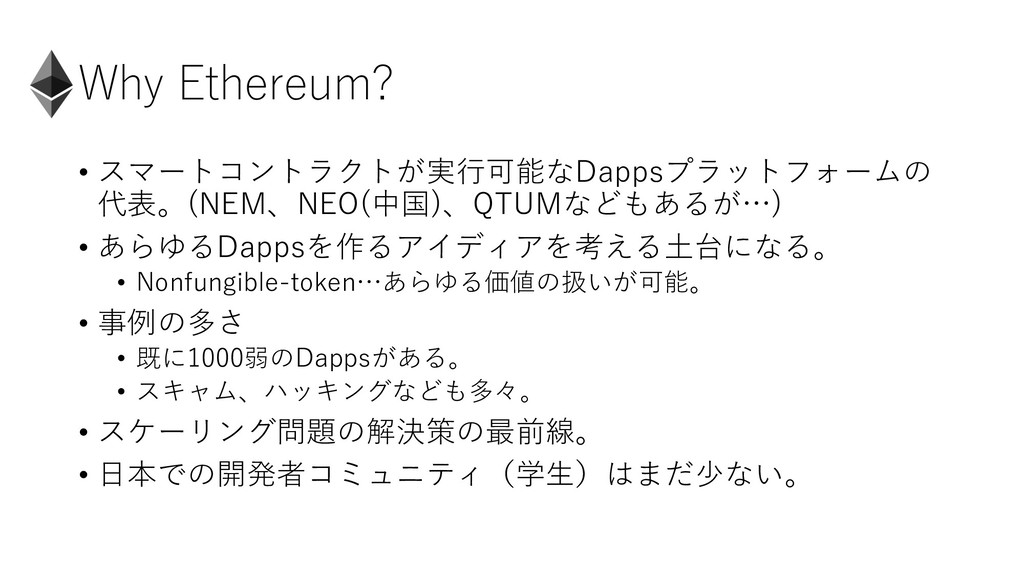 Why Ethereum? • スマートコントラクトが実⾏可能なDappsプラットフォームの 代表。(NEM、NEO(中国)、QTUMなどもあるが…) • あらゆるDappsを作るアイディアを考える⼟台になる。 • Nonfungible-token…あらゆる価値の扱いが可能。 •